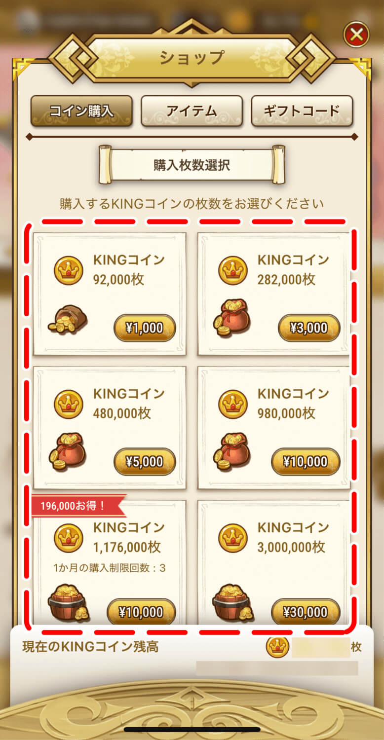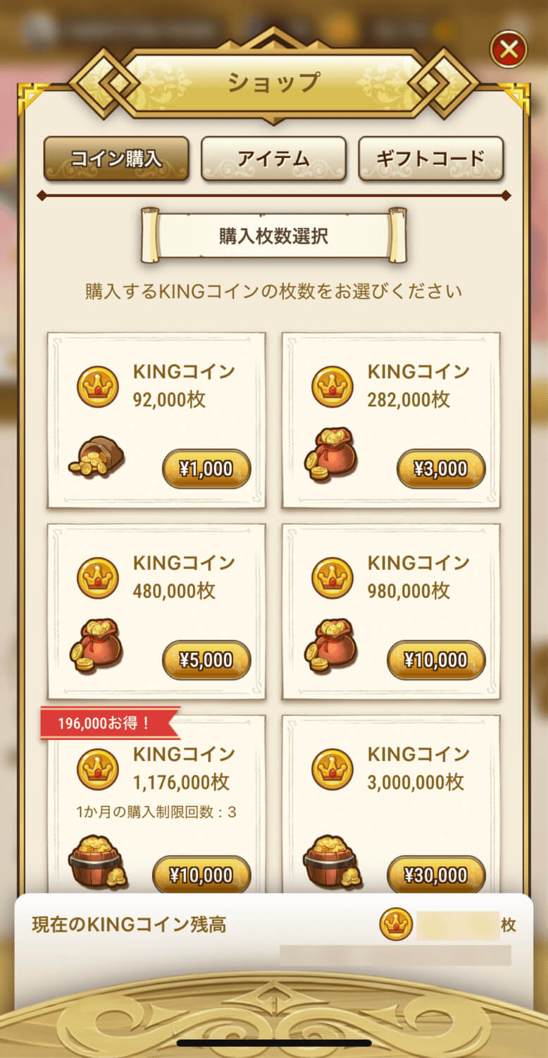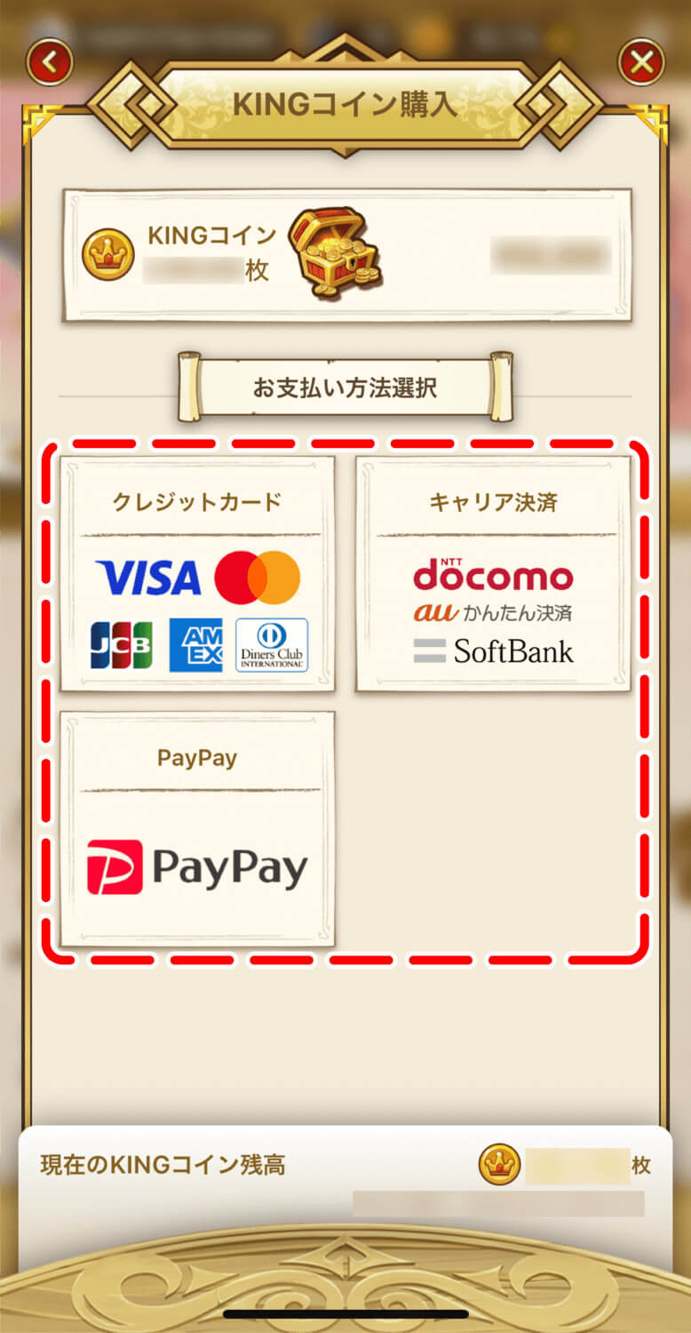 チャージ方法を選択すると、KINGコインのチャージが完了します!