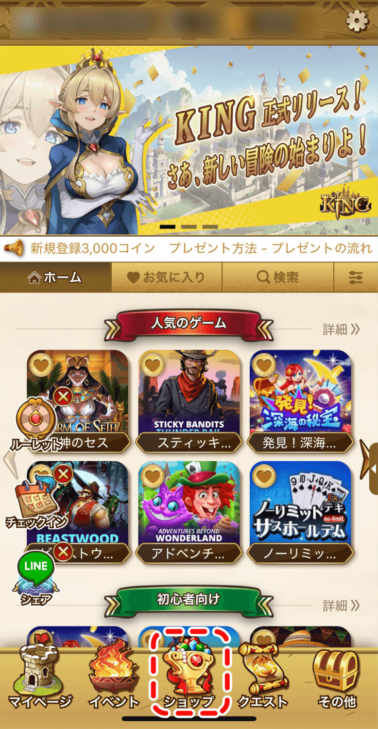 システムが自動的にKINGショップのページに遷移しない場合は、ホーム画面でKINGショップのボタンをクリックしてください。